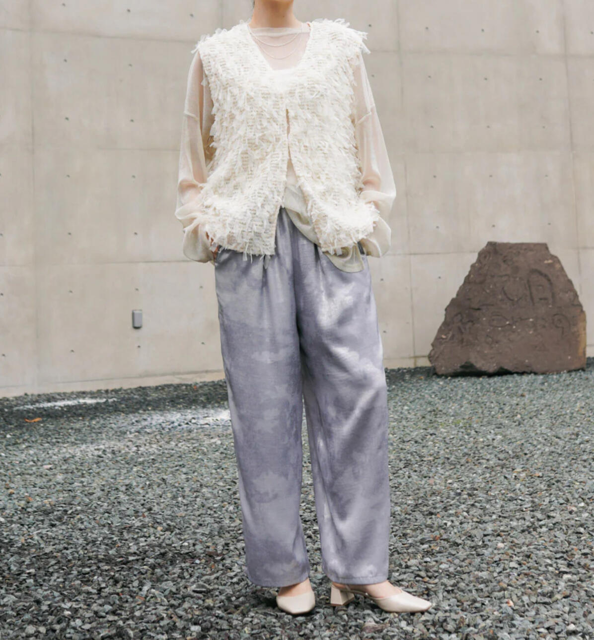 チュールをリボン状にして編みんだ素材が特徴的な素材。軽くてストレッチがあるので気軽に着ていただけます。