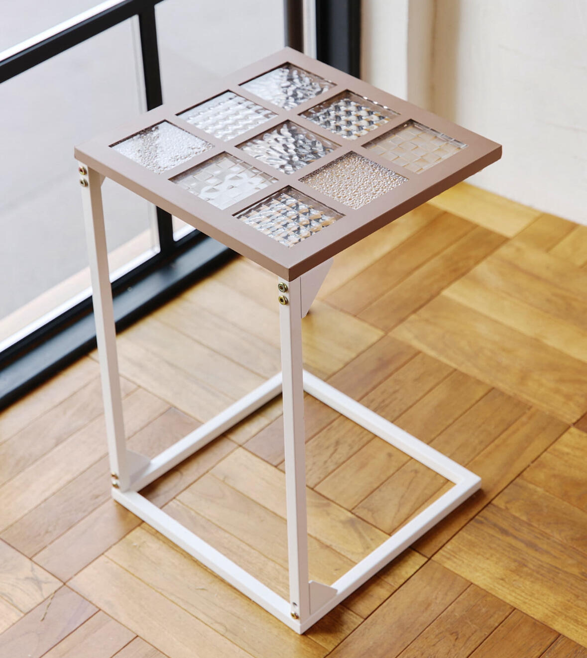 ●模様の入ったデザインガラスを組み合わせたガラストップサイドテーブル。