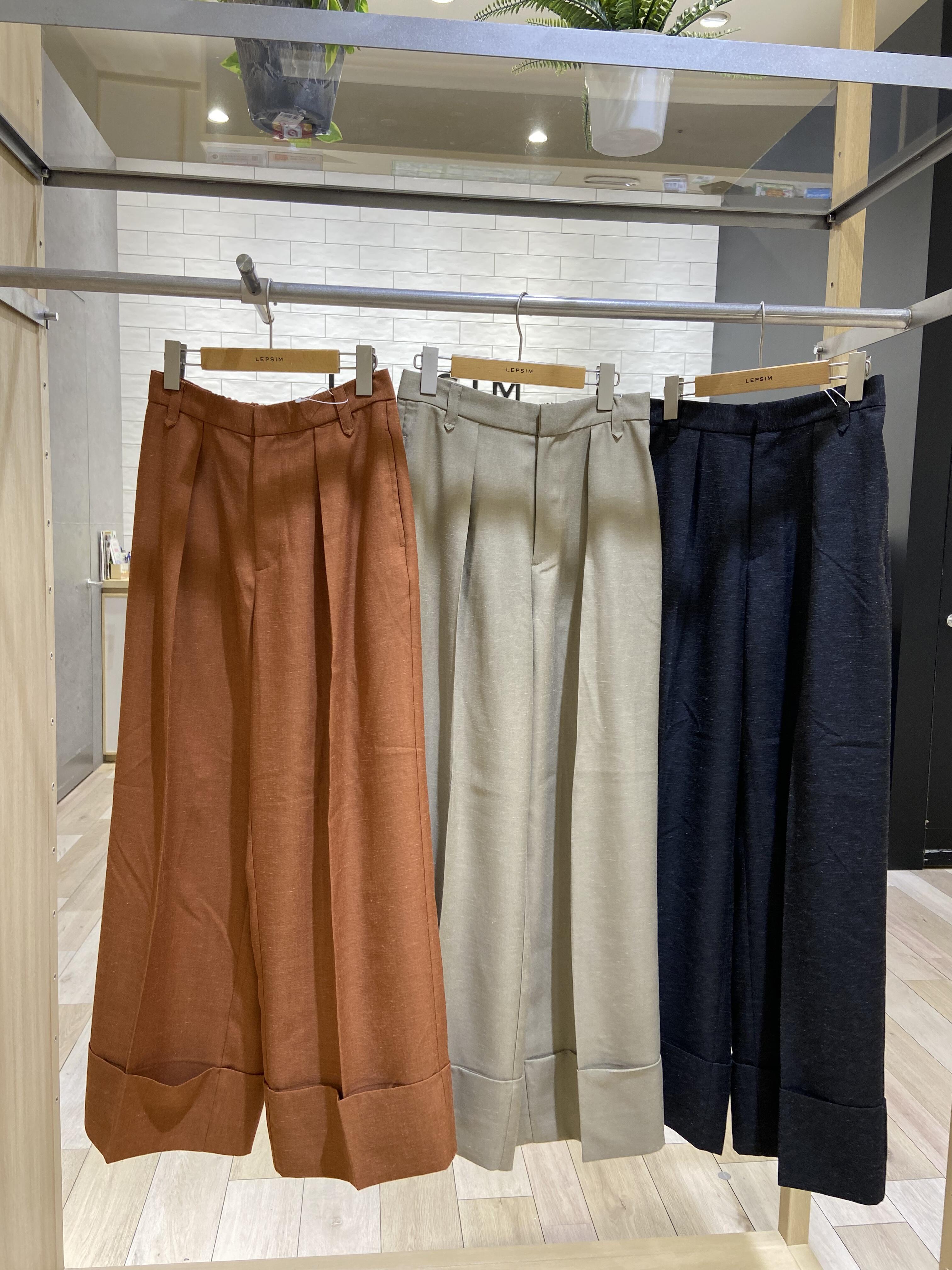 シンプルながらフロント部分のタックや、裾の折り返しデザインがポイントになっています(^ν^)