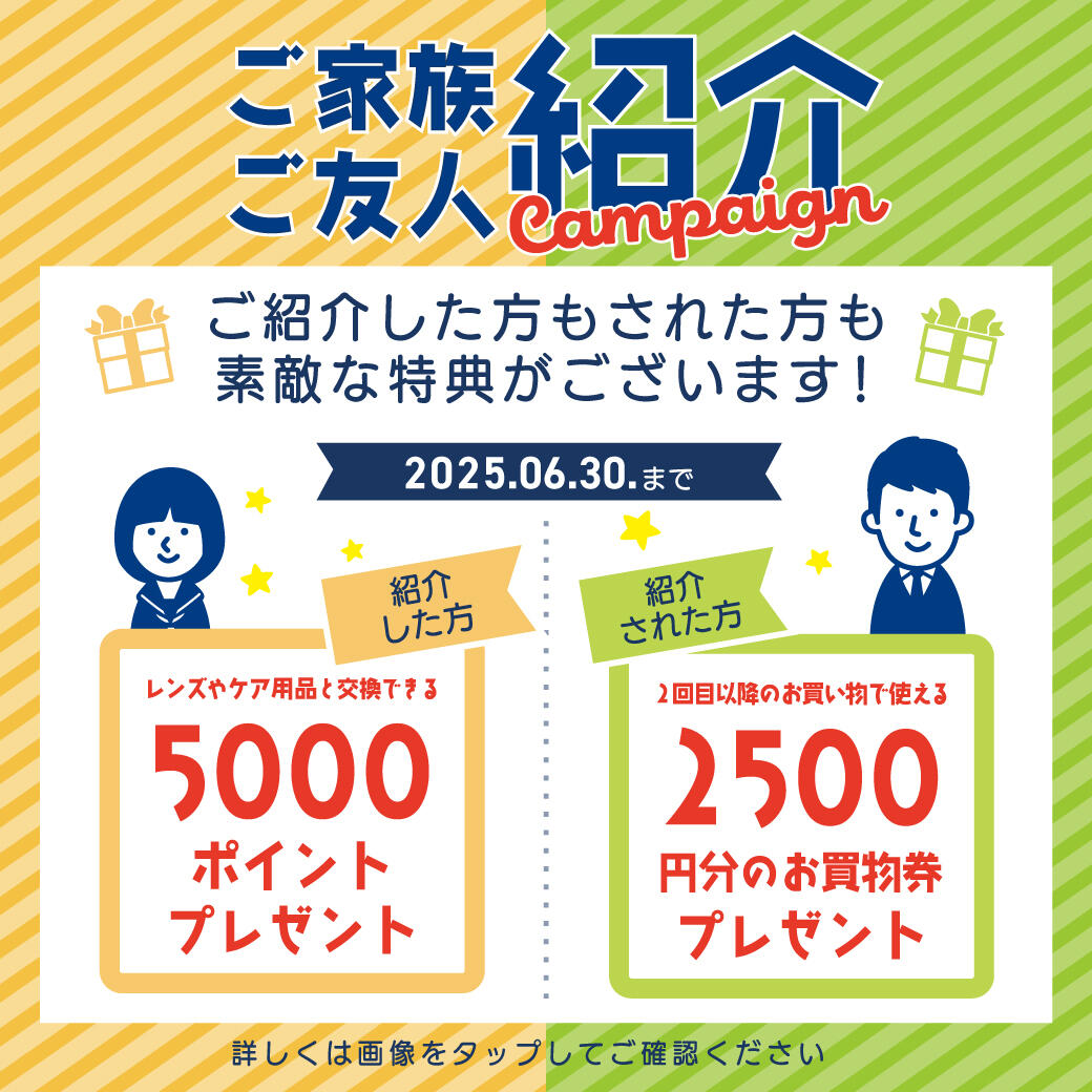 当社で初めてコンタクトをご購入される方をご紹介いただきますと、紹介した方、された方の双方に素敵な特典がございます!